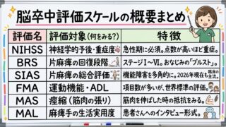 【現役OT執筆】作業療法士国家試験で頻出の脳卒中評価スケール(BRS, SIAS, FMA, NIHSS等)を一覧表で徹底解説!「項目数や点数が覚えられない」と悩む学生向けに、暗記用ゴロ合わせや比較表、過去問演習をまとめました。この記事で脳卒中分野の得点源を確実に抑えましょう。