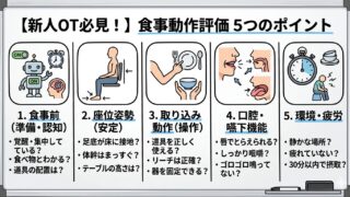 「食事評価、どこを見ればいいの?」と悩む新人作業療法士必見!2年目OTのぽこぽこが、臨床で即活用できる詳細な「食事評価チェックリスト」を公開。姿勢・操作・嚥下・環境まで、5つの視点で評価を介入に繋げるコツを分かりやすく解説します。