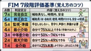 FIM(機能的自立度評価法)の点数判定で迷う受験生へ。現役作業療法士が「触れたら4点、触れなきゃ5点、道具を使えば6点」の魔法の合言葉で解説!見やすい比較図解と過去問演習付きで、国家試験のFIM問題を確実に得点源にするための完全ガイドです。