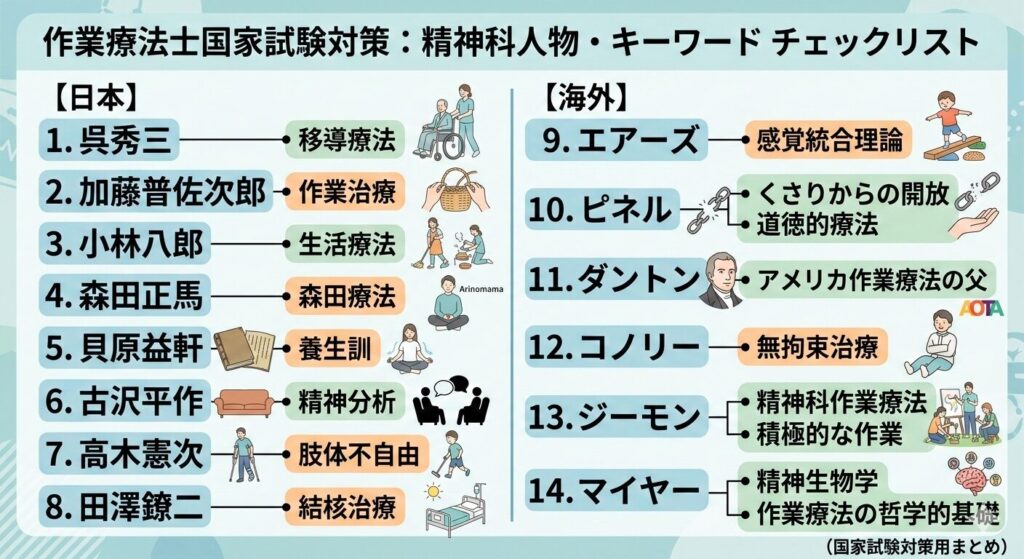 まずは日本の精神科作業療法の礎を築いた偉人たちです。漢字が多いため、視覚的にセットで覚えましょう。専門問題で頻出です!!