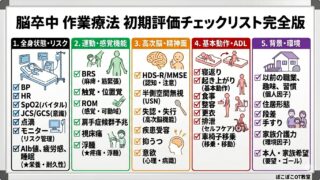 臨床 【脳卒中初期評価】何からやる?新人作業療法士が迷わない4ステップと優先順位の鉄則|図解・PDF付 脳卒中患者の初期評価で「項目が多すぎて優先順位がわからない」と悩む新人作業療法士へ。2年目OTのぽこぽこが、評価の進め方を4ステップで徹底解説。臨床で即活用できるチェックリストと図解、ダウンロード可能なPDF付き。この記事で評価の不安を自信に変えましょう! 2026.04.06 臨床